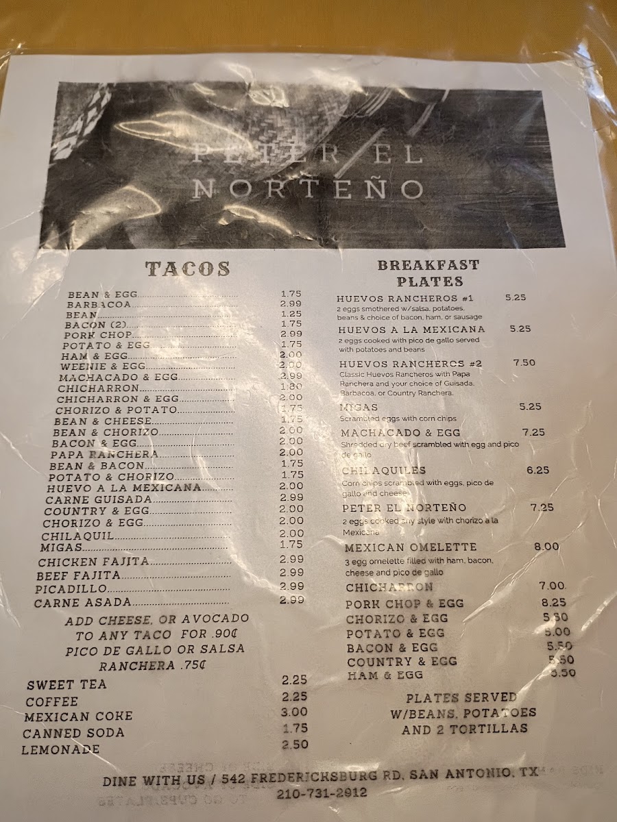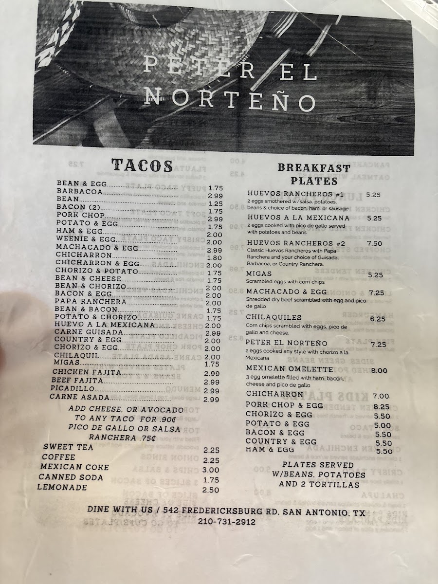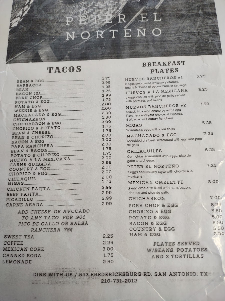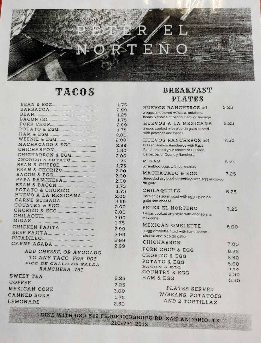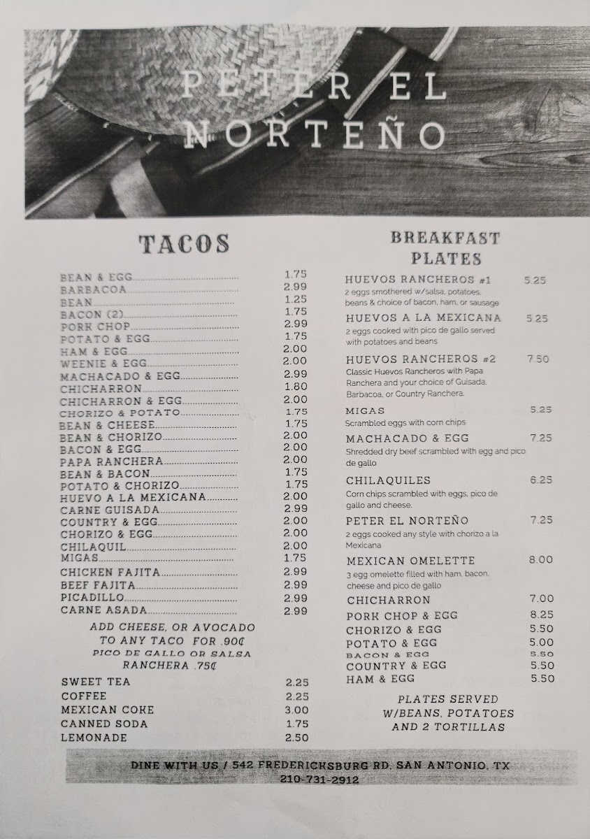 Welcome to Peter El Norteño, where your culinary journey begins at our vibrant restaurant located at 542 Fredericksburg Rd, San Antonio, TX 78201. Our menu is a feast for the senses, featuring irresistible specialties that are sure to tempt your taste buds. Indulge in our Chicken Fried Chicken and Chicken Fried Steak for a comforting classic, or savor the zesty flavors of our Beef Fajita Plate and Flauta Plate. Don’t miss out on the Carne Guisada Taco or the satisfying Chicken Tenders with Onion Rings. For breakfast lovers, our Pancakes with two eggs and Ham Omelette are simply divine. And if you're in the mood for something hearty, try our Pork Chop & Egg or the comforting bowl of Menudo. With dishes like Cheese Enchiladas, Carne Guisada Plate, and Huevos Rancheros with Pork Chop, each bite at Peter El Norteño promises to transport you to a world of rich flavors and home-cooked goodness. Come and explore our menu; we can't wait for you to experience the deliciousness that awaits!
